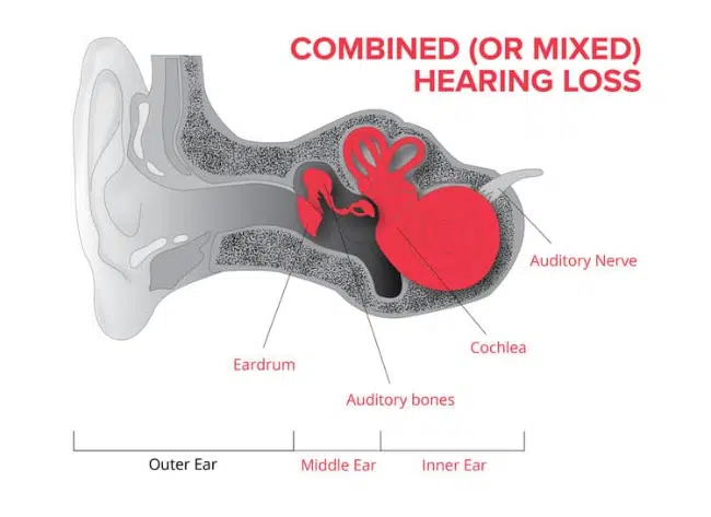 Sometimes a conductive hearing loss occurs in combination with a sensorineural hearing loss(SNHL). In other words, there may be damage in the outer or middle ear and in the inner ear(cochlea) or auditory nerve. When this occurs, the hearing loss is referred to as a mixed hearing loss.